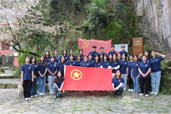 在团支书李小菊的带领下,团员们乘车前往乌当区羊昌镇黄连村长征路起点处,众人呈一列纵队步行前往黄连村的红色基地,路边矗立着红军雕塑,一段段红色标语见证了革命先辈对革命理想的不懈追求。抵达黄连村红色基地时已是正午,首先映入眼帘的便是刷在石壁上“还我河山”四个大字,在正午阳光的照射下,显得熠熠生辉。基地的中心有一面由石头雕刻而成的党旗,党旗下面篆刻着入党誓词,誓词时刻告诉着共产党人身上应当肩负的使命与责任。